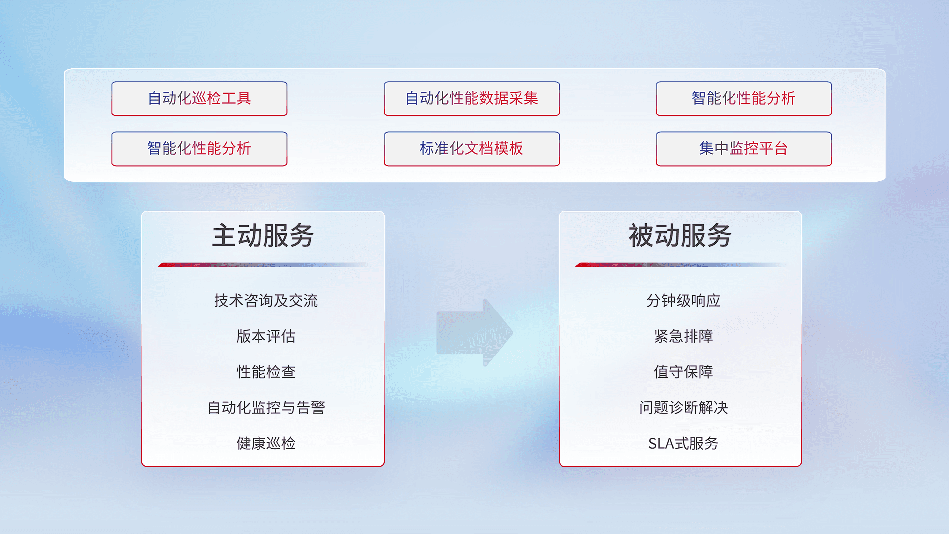 智能化工具和标准化文档,,,保障服务质量,,,,提供主动服务(包含技术咨询、、、、版本评估、、、性能检查、、、、自动化监控与告警、、健康巡检)和被动服务包含(分钟级响应、、、、紧急排障、、、、值守保障、、、问题诊断解决、、、SLA服务)。。。